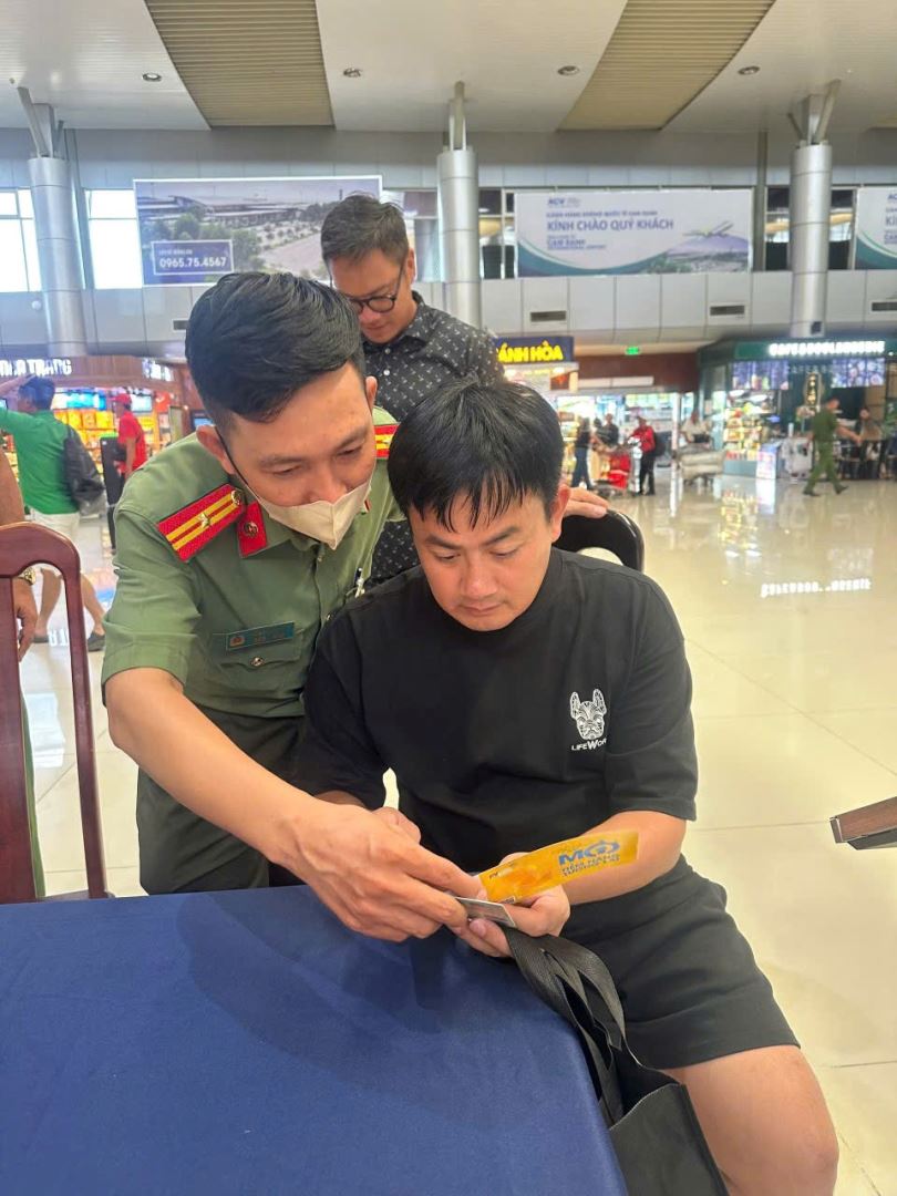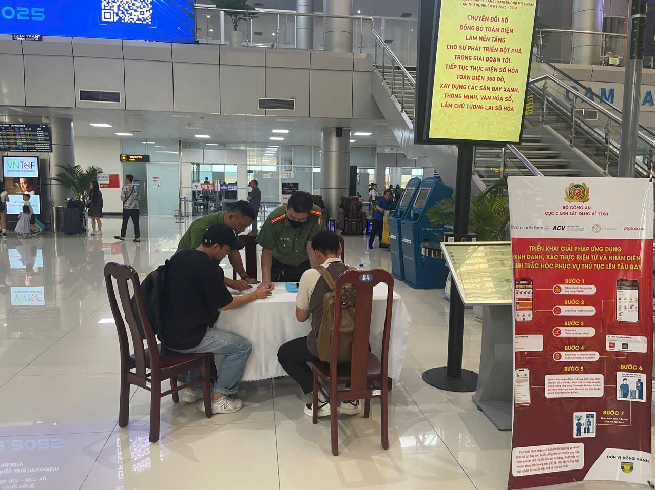 Cán bộ Phòng Quản lý xuất nhập cảnh Công an tỉnh Khánh Hòa hướng dẫn hành khách check-in, kiểm tra an ninh lên máy bay bằng công nghệ sinh trắc học và xác thực điện tử VneID tại Sân bay