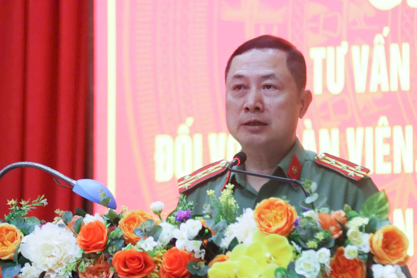 Đại tá Nguyễn Quân – Phó Bí thư Đảng uỷ, Phó Giám đốc Công an tỉnh phát biểu tại hội nghị