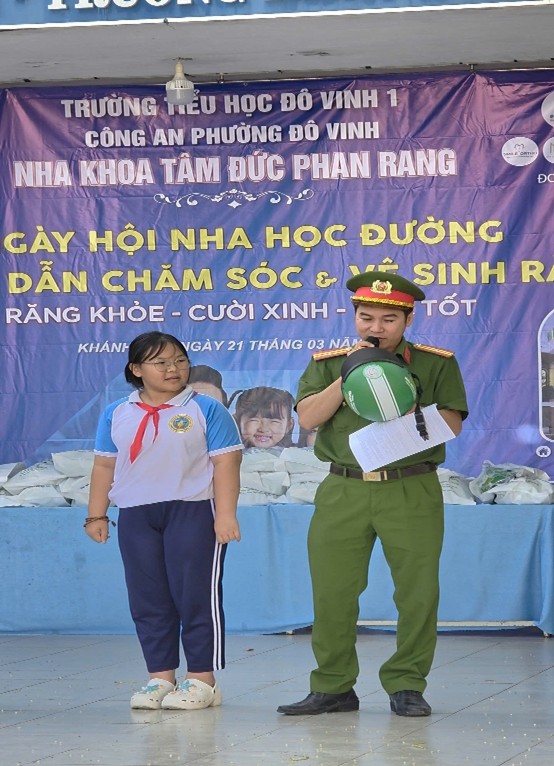 Ngày 21/3/2026, Công an phường Đô Vinh phối hợp với Nha khoa Tâm Đức Phan Rang tổ chức ngày hội nha học đường tại trường Tiểu học Đô Vinh 1. Tại buổi tuyên truyền, báo cáo viên của Công an phường đã phổ biến một số quy định cơ bản khi tham gia giao thông như đội mũ bảo hiểm và cài quai đúng quy cách, chấp hành tín hiệu đèn giao thông, đi đúng phần đường… thông qua hình thức hỏi đáp, giao lưu sinh động.