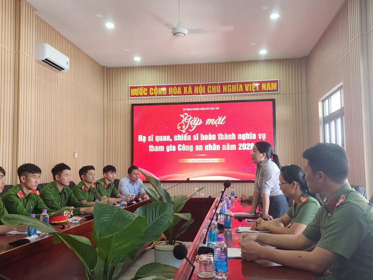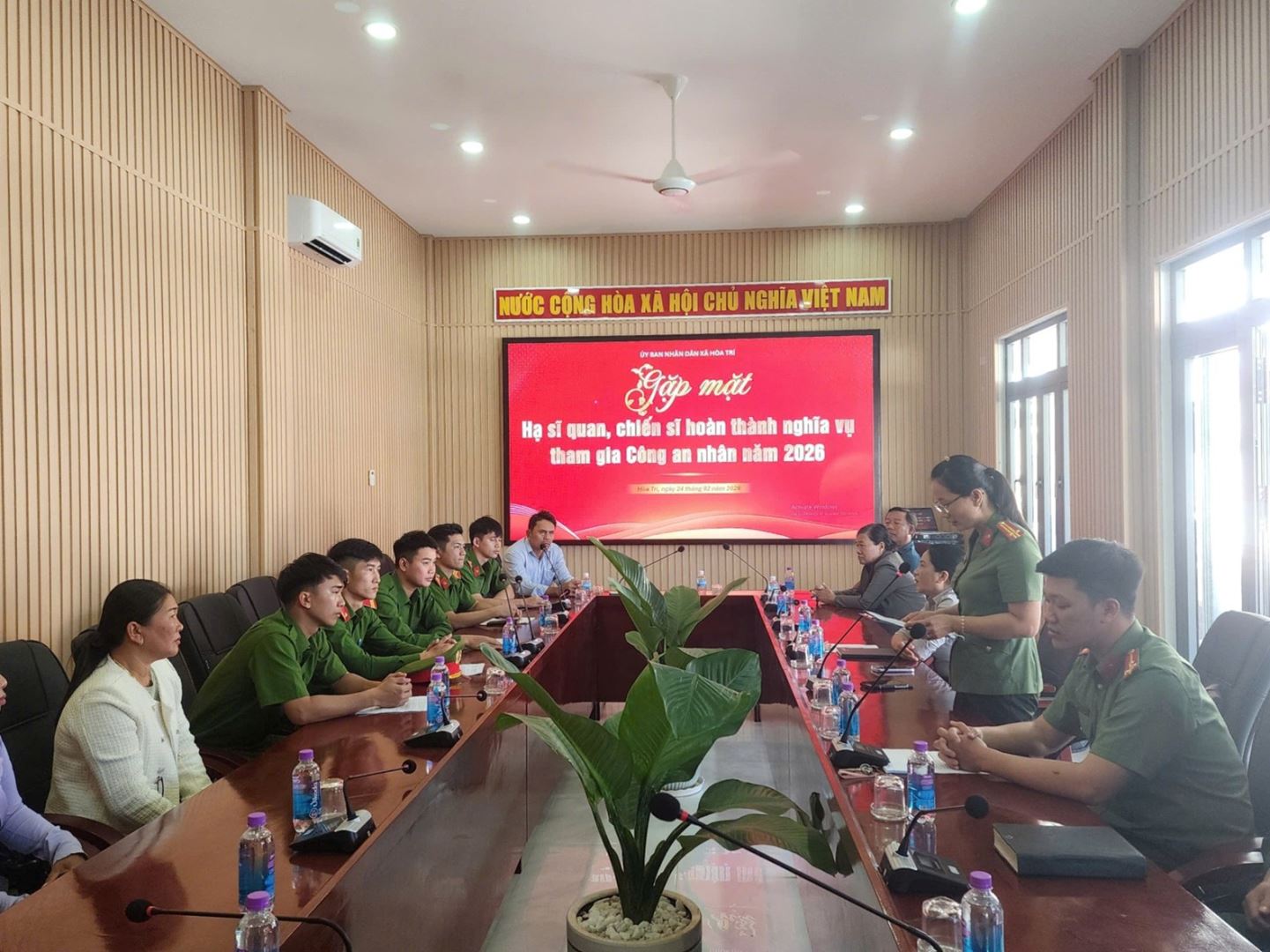 Thay mặt lãnh đạo Đảng ủy, HĐND, Ủy ban nhân dân, UBMTTQ xã Hòa Trí đồng chí Lê Thị Mỹ Linh, Ủy viên BTV Đảng ủy, Phó Chủ tịch UBND xã đến dự và phát biểu chỉ đạo buổi lễ. Lãnh đạo địa phương rất mong các đồng chí xuất ngũ tiếp tục phát huy phẩm chất người chiến sĩ CAND, gương mẫu chấp hành chủ trương, chính sách pháp luật, tích cực tham gia phong trào bảo vệ an ninh Tổ quốc và đóng góp xây dựng quê hương xã Hòa Trí ngày càng giàu đẹp, văn minh; chỉ đạo các ban, ngành, thôn và gia đình tiếp tục quan tâm, định hướng, tạo điều kiện cho các chiến sĩ xuất ngũ sớm ổn định cuộc sống.