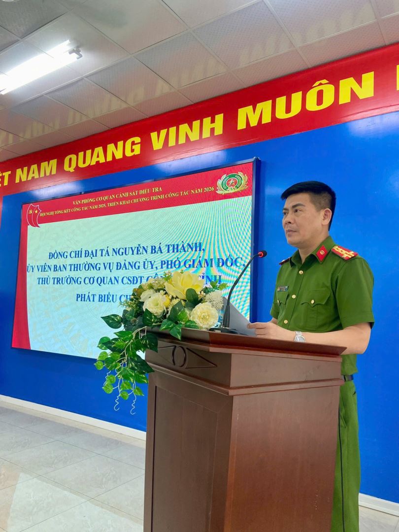 Phát biểu chỉ đạo tại Hội nghị, Đại tá Nguyễn Bá Thành ghi nhận và biểu dương những kết quả, thành tích mà Văn phòng Cơ quan Cảnh sát điều tra đã đạt được trong năm qua; đồng thời chỉ ra một số tồn tại, hạn chế cần khắc phục. Đồng chí đề nghị đơn vị trong năm 2026 tiếp tục giữ vững và phát huy kết quả đã đạt được, nỗ lực vượt qua khó khăn, phấn đấu hoàn thành xuất sắc nhiệm vụ được giao; trước mắt là triển khai hiệu quả Kế hoạch cao điểm tấn công, trấn áp tội phạm, bảo đảm an ninh, trật tự Tết Nguyên đán Bính Ngọ 2026.