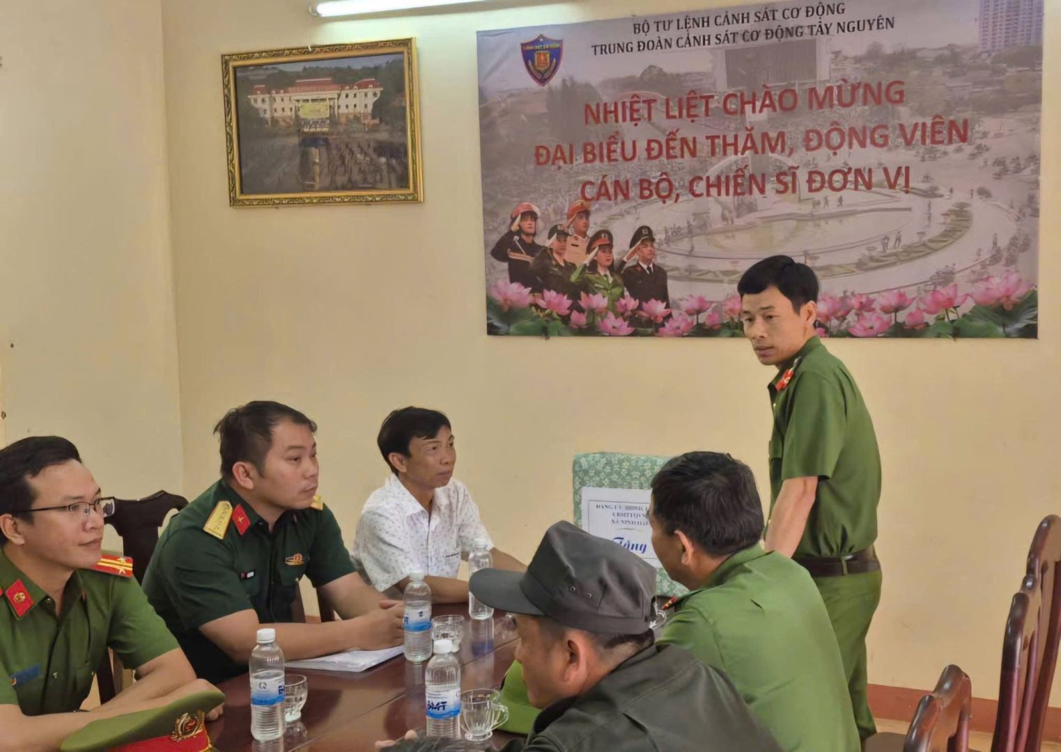 Ảnh: Đại diện Lãnh đạo Trung đoàn CSCĐ Tây Nguyên phát biểu tại buổi thăm, động viên