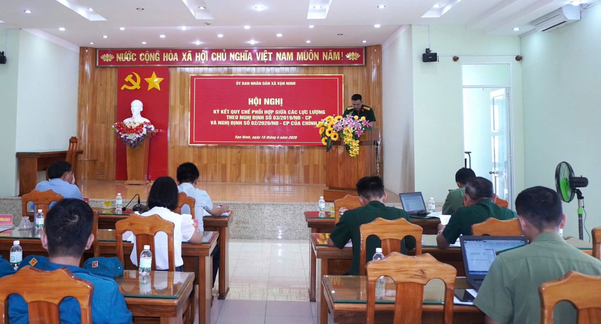 Chiều 16/4/2026, UBND xã Vạn Ninh tổ chức hội nghị ký kết quy chế phối hợp thực hiện Nghị định số 03/2019/NĐ-CP của Chính phủ về phối hợp giữa Bộ Công an và Bộ Quốc phòng trong thực hiện nhiệm vụ bảo vệ an ninh quốc gia, bảo đảm trật tự an toàn xã hội, đấu tranh phòng, chống tội phạm và nhiệm vụ quốc phòng (Nghị định số 03); Thực hiện Nghị định số 02/2020/NĐ-CP của Chính phủ quy định về hoạt động phối hợp của lực lượng dân quân tự vệ (Nghị định số 02).