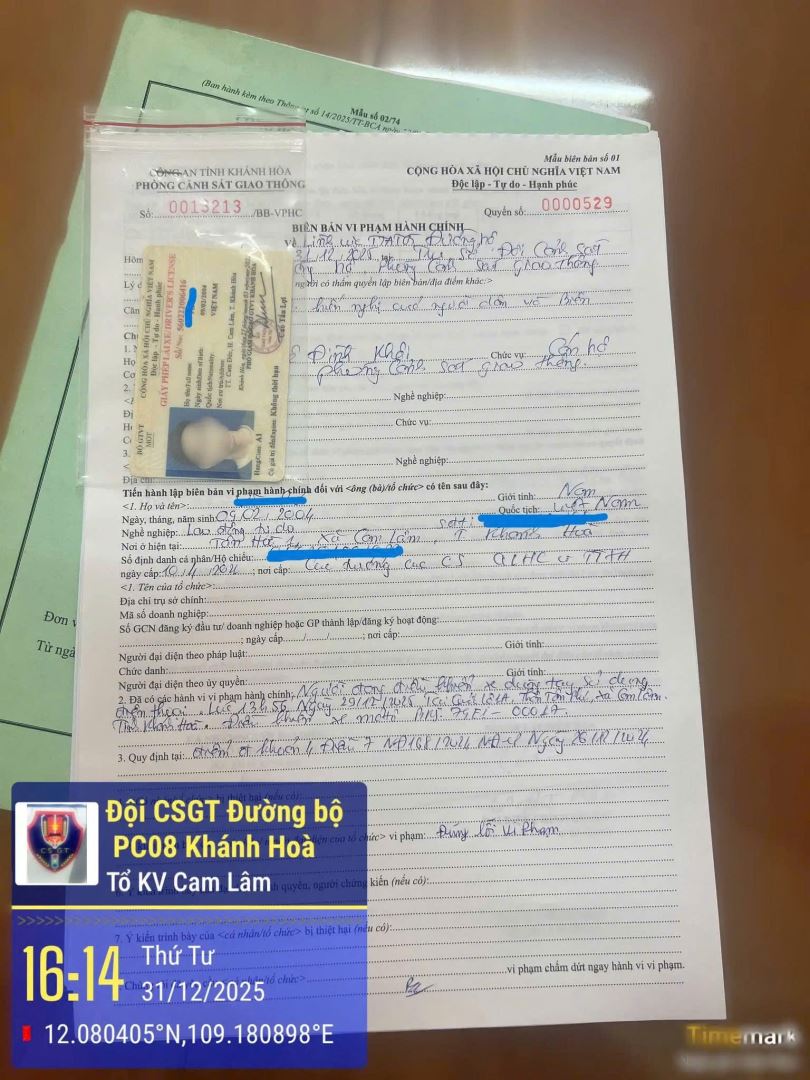Ngày 31/12/2025 Đội CSGT đường bộ khu vực Cam Lâm đã mời anh V.B – 21 tuổi, trú tại xã Cam Lâm, là nhân viên sửa xe (không phải là cán bộ, chiến sĩ Công an) đến làm việc tại đây anh B đã thừa nhận hành vi vi phạm.